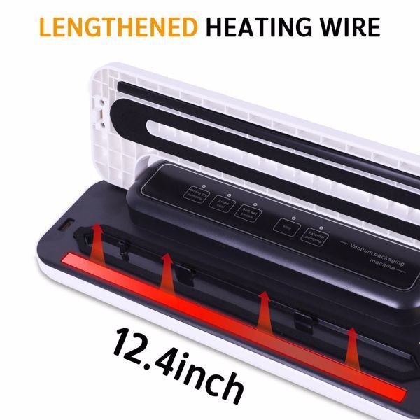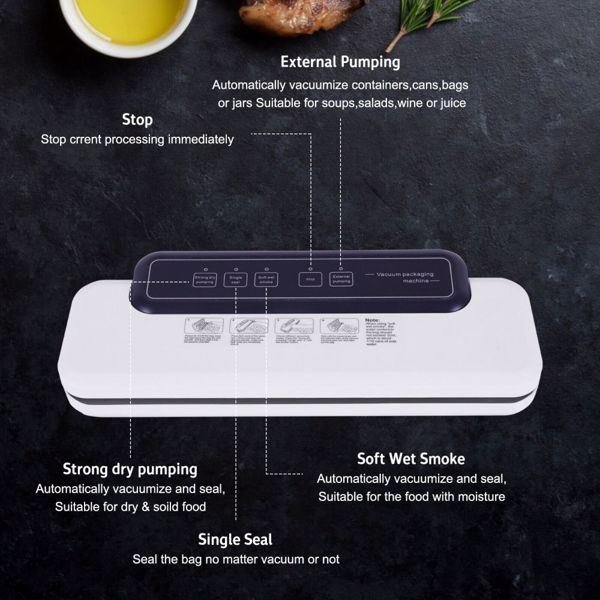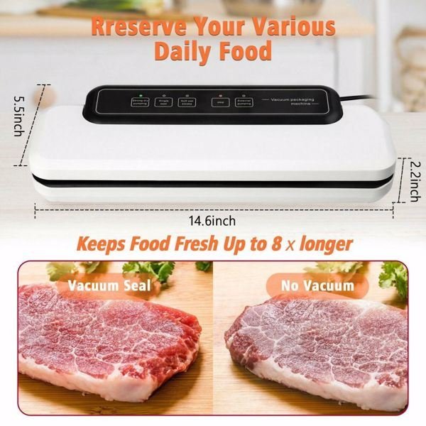 This vacuum sealer reduces oxidation by removing most of the air from the sealed bag and prevents fresh air from entering the sealed container; thus extending the life of the food. Quickly draining the air around the food; it can be used to preserve fresh foods such as raw meat; fresh fruits; and vegetables. The vacuum sealing process extends the freshness of food. This vacuum sealer is made of durable and easy-to-clean material; and the thermal protection function is designed with safety. Adopted a unique design; the slim body of it does not take up space.