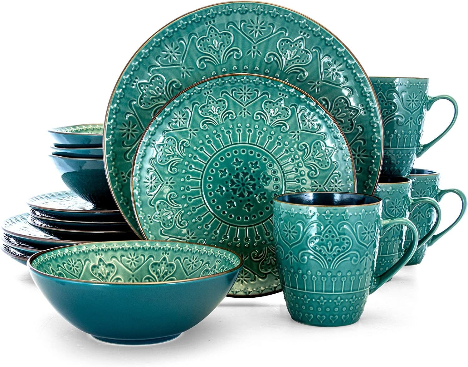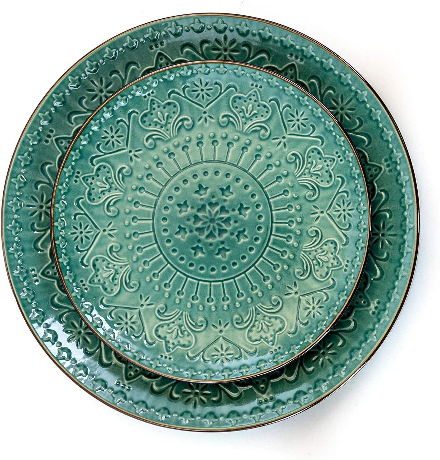 With a calming tone of Sea Green and textured mandala style designed plates; this set is ready to make a statement at your next gathering. Stoneware construction of each dish is ideal for special occasions and durable for everyday use.