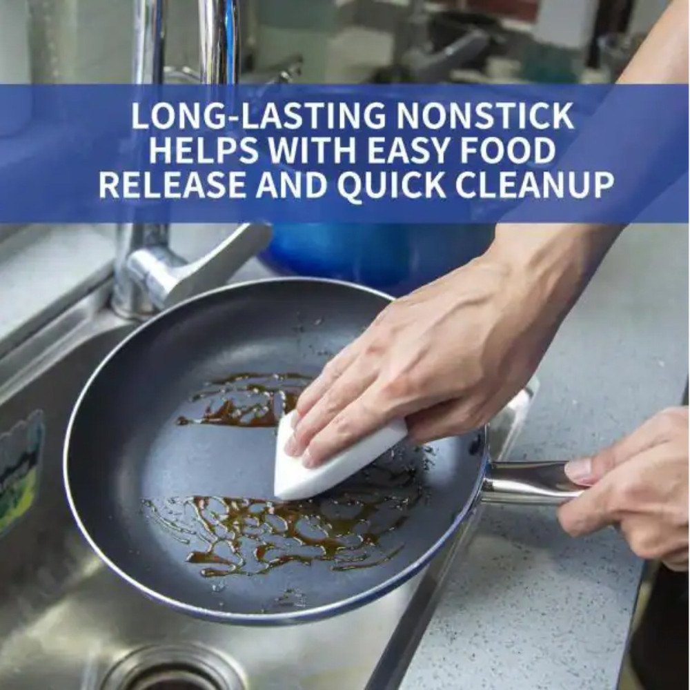 3.The cookware set is coated with nonstick interior to prevent food from sticking and make the food slide smoothly when cooking. The non-stick coating also has a feature of scratch resistance to use longer while giving it a maximum performance to save the oil and clean up easily.