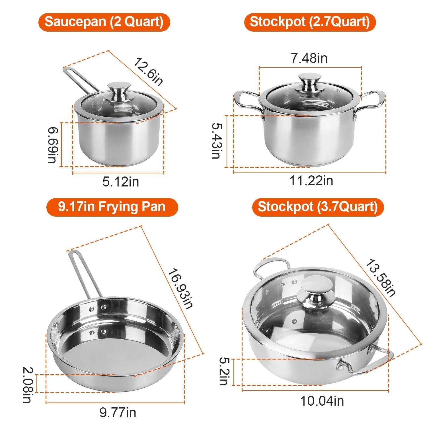 1.This pots and pans set includes 3.7-quart stockpot with lid, 2.7-quart stockpot with lid, 9.17 in frying pan, 2 quart saucepan with lid