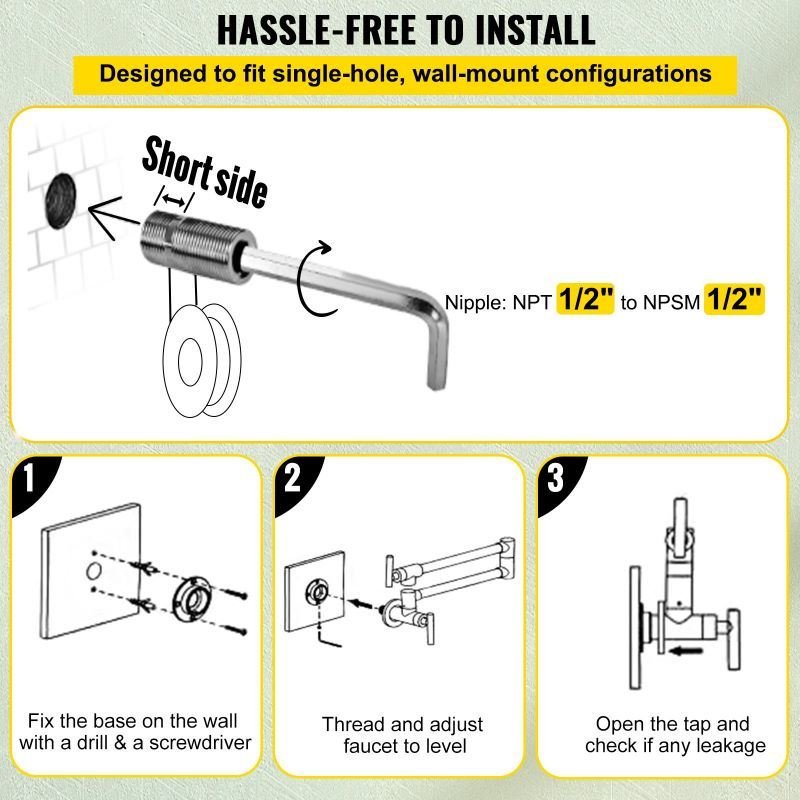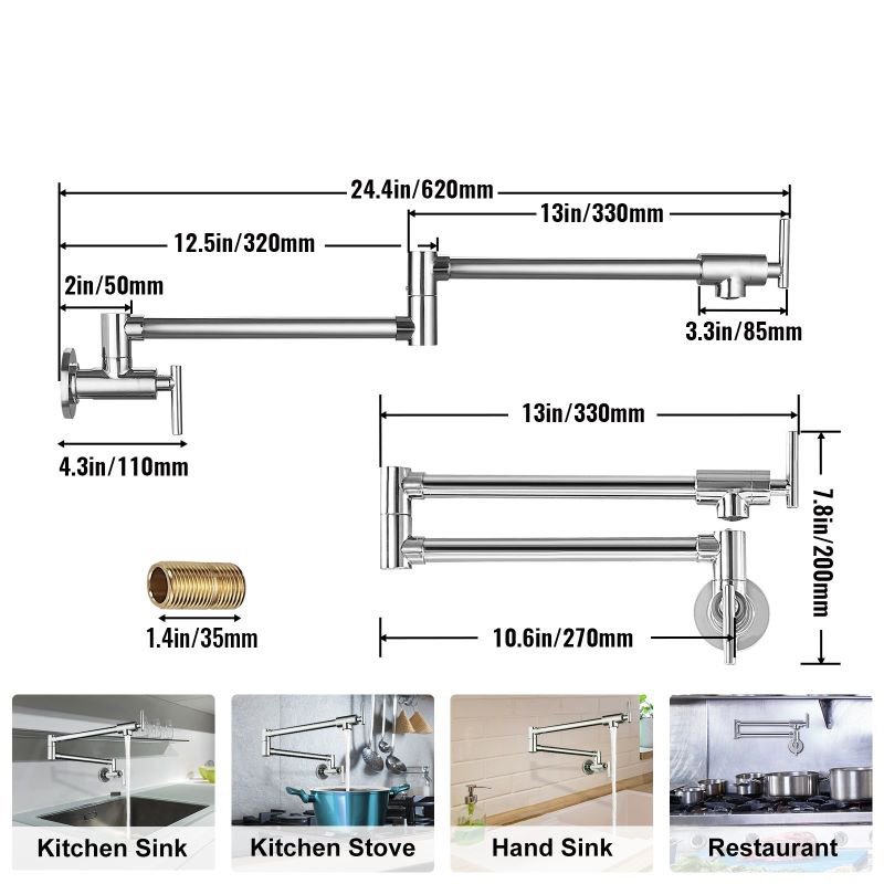 This pot filler wall is equipped with double joints and double handles; which can be rotated 360 degrees. The length can reach 24.4 inches; and it is easy to operate with one hand.
